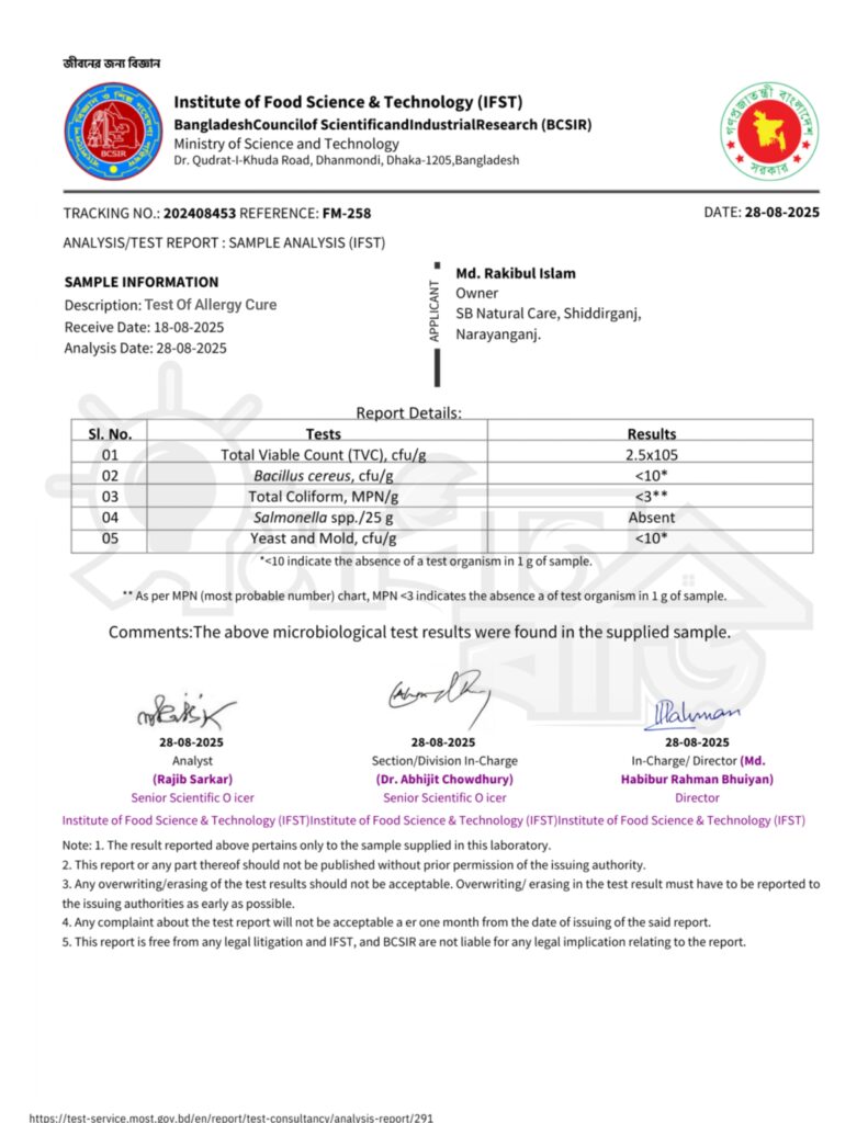 হাঁচি, কাশি, ঠাণ্ডা লেগে থাকা, নাক দিয়ে পানি পড়া, নাকবন্ধ এবং শ্বাসকষ্ট শতভাগ নির্মূল করে।